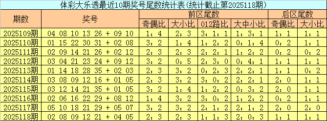 上期回顾:体彩大乐透第2025118期开出号码:02 08 09 12 21 + 04 05,其中前区奖号尾数奇偶比为2:3,大小比为2:3,012路比为1:1:3,大中小比为2:0:3,后区奖号尾数奇偶比为1:1,大小比为1:1。